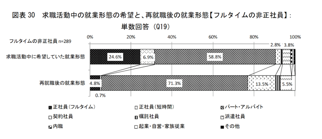 再就職に関する調査では、正社員として再就職することを希望していた人が24.6%いるにも関わらず、実際に正社員になれたのは4.8%という結果が出ています。