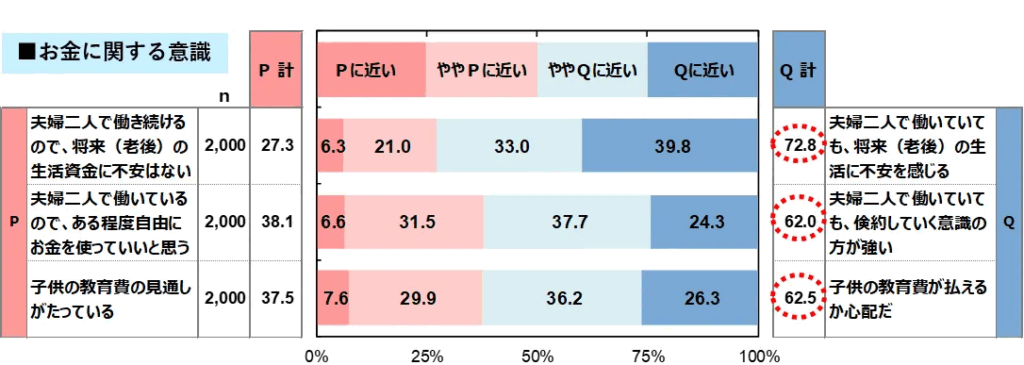 この調査結果によると、共働き家庭でも、「将来の生活に不安を感じる」「倹約していく意識の方が強い」「子供の教育費が払えるか心配だ」と回答した家族は6割以上です。