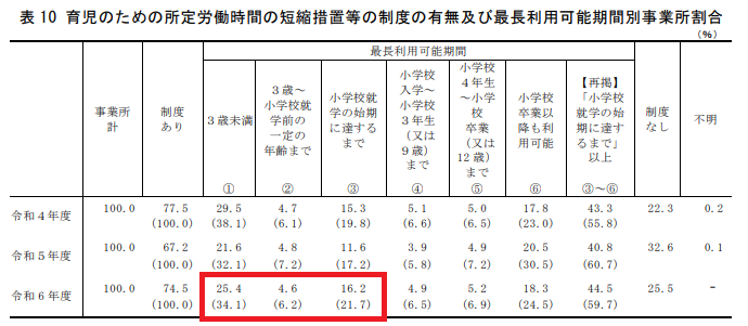 つまり、企業の6割以上が小学生以降は時短勤務ができないということ。