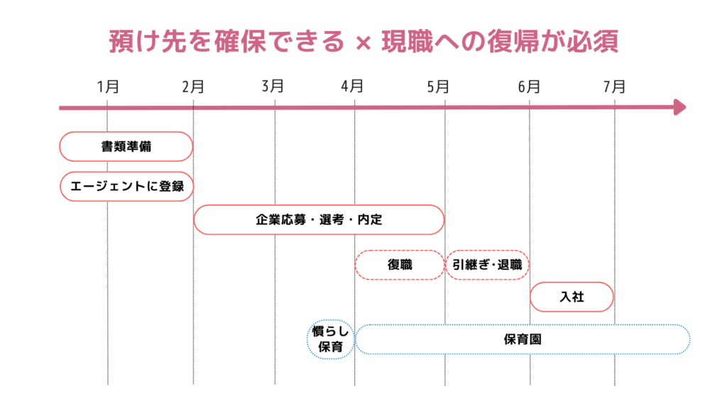 保育園など子どもの預け先を確保できそうで、かつ現職への復帰が必須であれば、6月入社を目指して転職活動を始めるのが理想です。