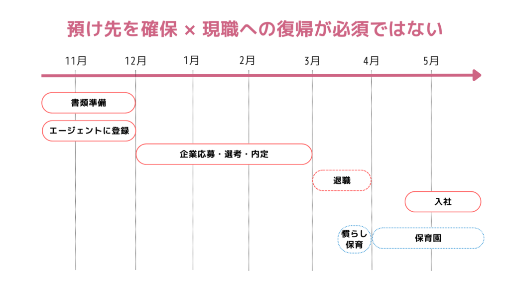 あえて現職に復帰したい理由がなければ、慣らし保育が終わった4~5月頃に転職先へ入社(2~3月に内定を獲得)できるよう転職活動を始めておくとよいでしょう。