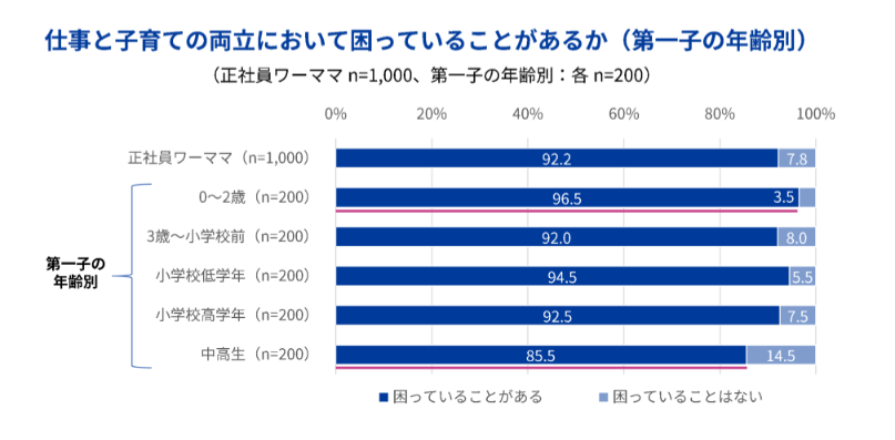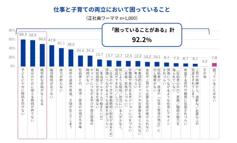 キャリア構築や自己実現について悩むワーママもいますが、それ以上に子供と過ごす時間が足りないことを悩んでいるワーママが多いとわかります。
