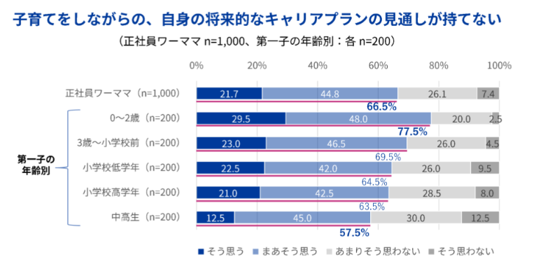 子供が0~2歳のワーママは、77.5%もの人が「将来的なキャリアプランに見通しが持てない」と回答しています。