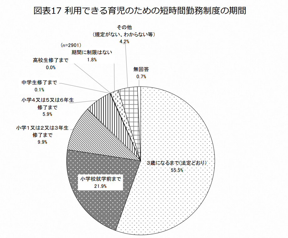 小学校4~6年生や中高卒業まで時短勤務できる企業の割合を含めても、全体の7.8%にしかなりません。過半数(55.5%)を占めているのが「3歳になるまで(法定どおり)」の制度にしている企業で、延長できたとしても「小学校入学まで」が大半を占めていることがわかります。