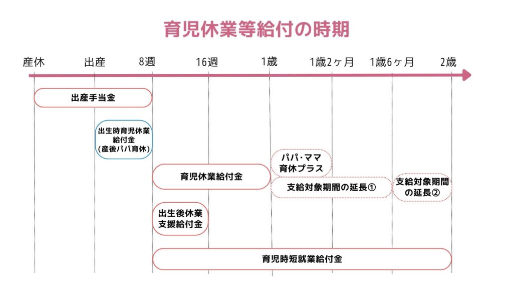 パパと交代で育休を取る場合は1歳2ヶ月、認可保育園に入れない場合は2歳までという例外はありますが、原則子供が1歳になる前日までが給付期間です。