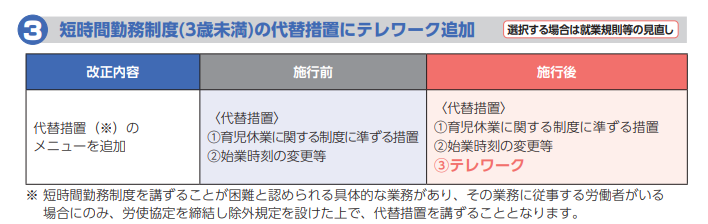 短時間勤務制度(3歳未満)の代替措置にリモートワークが追加