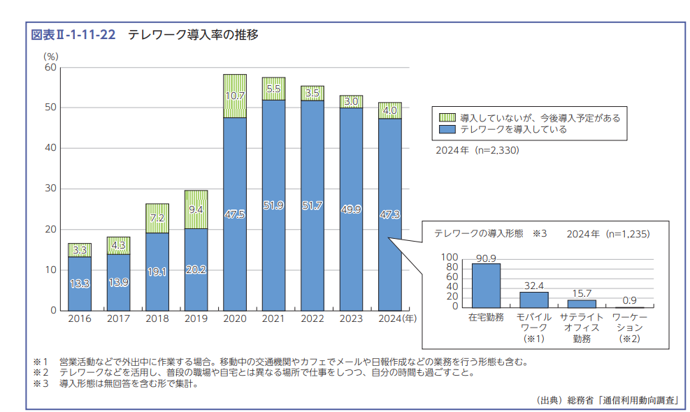 リモートワーク導入率は2020年に爆発的に伸び、2010年代に比べるとリモートワークできる環境を整えた企業が増えました。在宅勤務だけでなく、モバイルワーク、サテライトオフィス勤務、ワーケーションなどフレキシブルな働き方を認める企業も出てきており、ワーママ以外も活用できるシステムとして確立しつつあります。